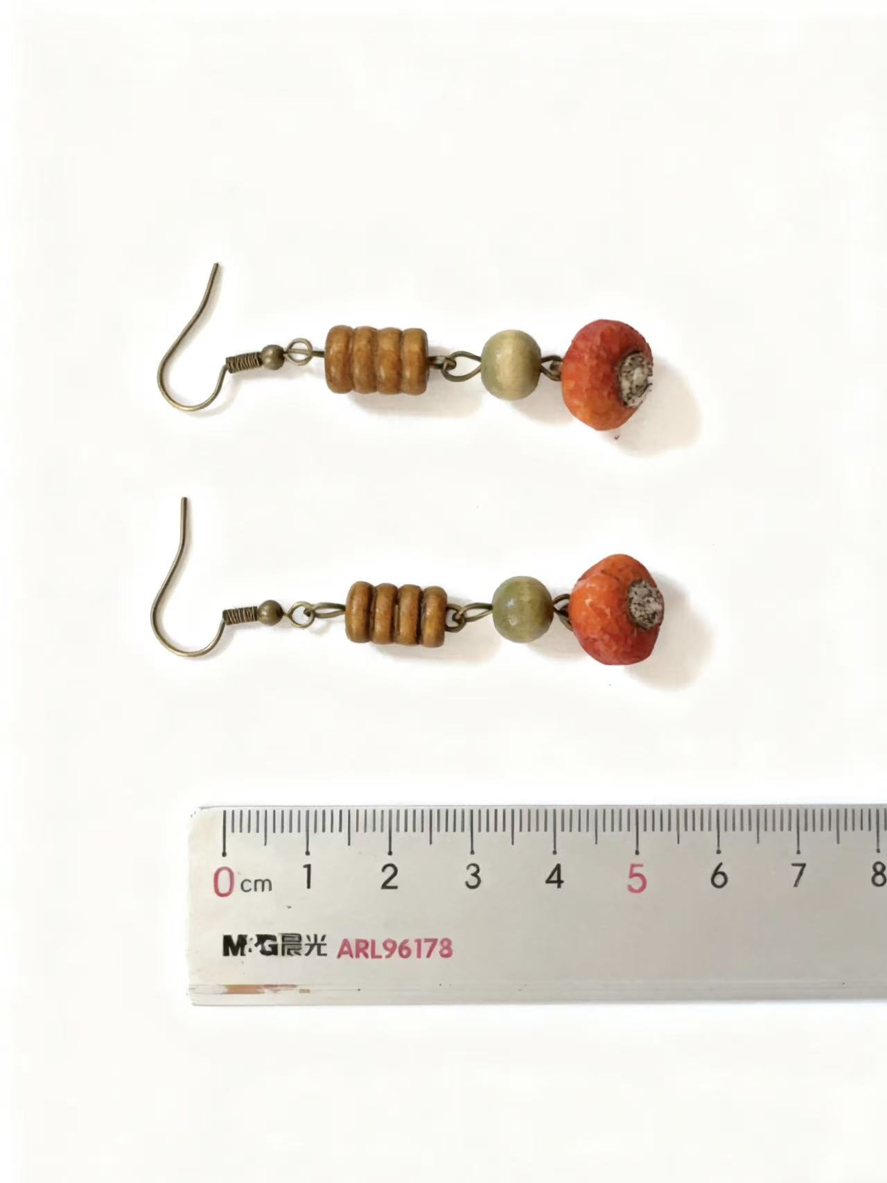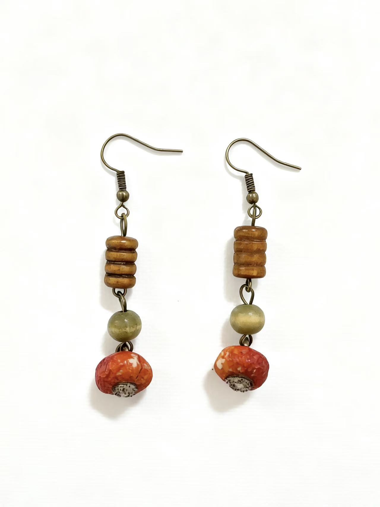 Handcrafted earrings made with natural wood beads and wild rose hips.
