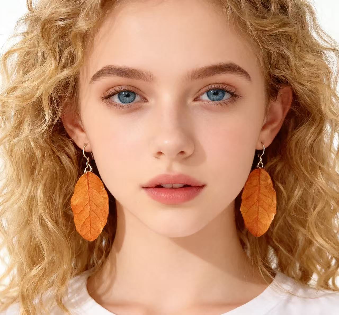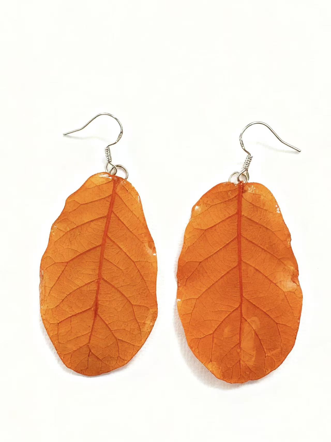 “Leaflight · Seasons in Amber” Handmade Earrings — Preserved Orange Leaf in Resin