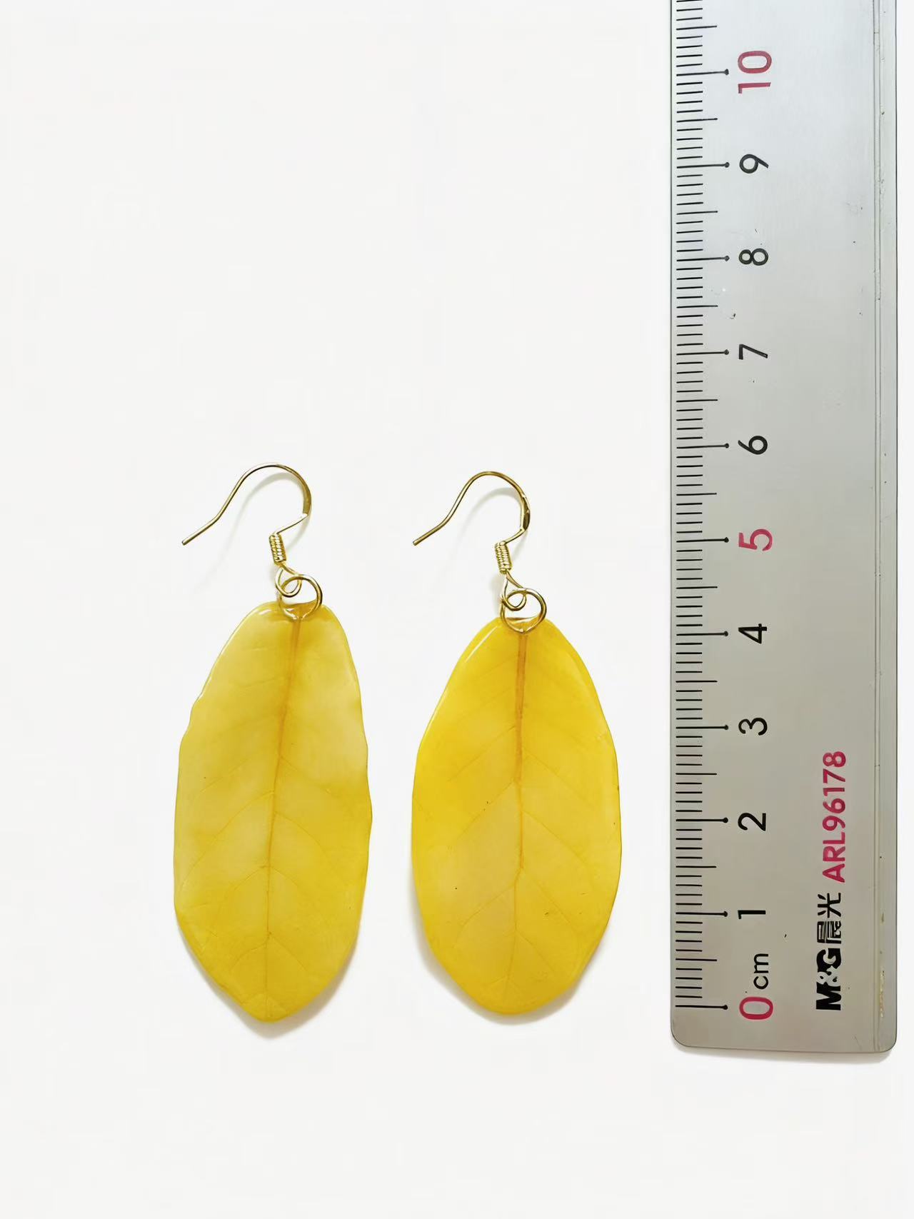 Handcrafted earrings made from real yellow leaves, preserved in their natural form.